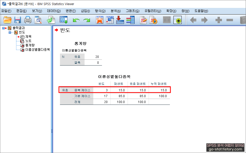 지금은 실습데이터가 20개뿐이어서 중복 케이스 식별 기능을 사용하지 않고서도 충분히 눈으로 중복 케이스를 손쉽게 알 수 있지만.. 만일 내가 분석해야 하는 데이터가 1만 개 이상이라면? 아니.. 1천 개만 된다고 생각해도 끔찍하다. 이 많은 데이터들 사이에서 중복값을 대체 어떻게 알아차릴 수 있단 말인가 ㅠㅠ