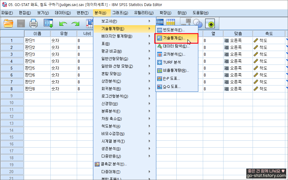 오늘 분석에 사용한 파일은 ‘judges.sav’라는 파일인데, 국문으로 하면 판단에 관한 자료인 만큼 왜도와 첨도가 중요할 수 있을 것 같아서 이 파일로 연습했다. 먼저 파일을 불러와 기술통계분석 창을 열어준다.