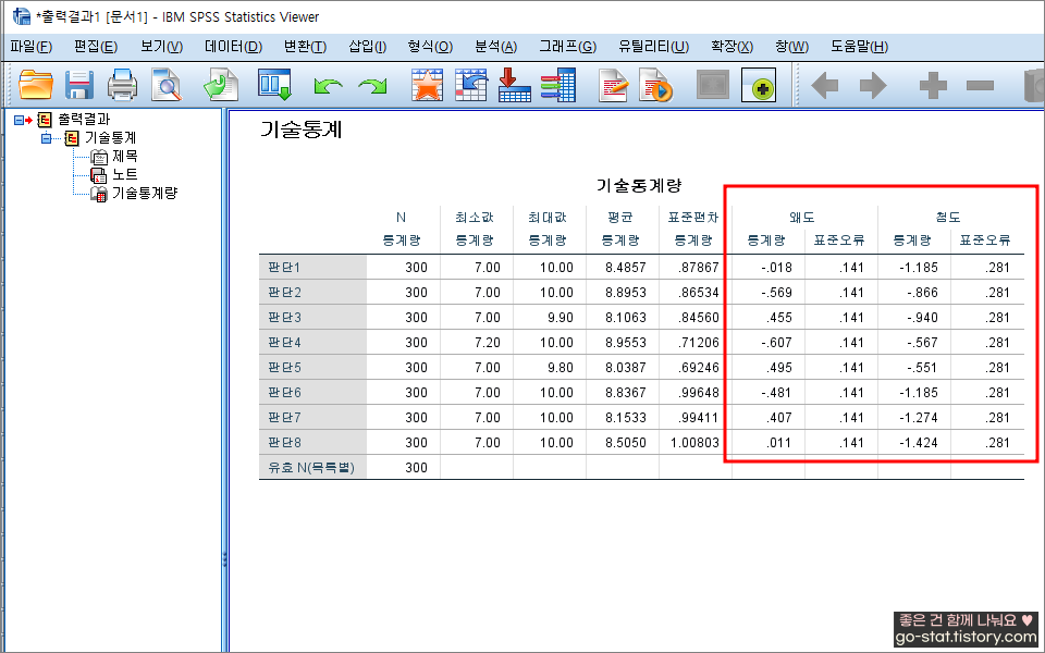 왜도와 첨도에 대한 ‘통계량’을 중심으로 결과를 해석하면 된다. 물론, 적정한 왜도와 첨도를 구분하는 기준은 학자마다 조금씩 다르다. 저마다 기준이 다른 것 같아서 방법론 책을 여러 권 찾아봤지만 책마다도 약간씩 차이가 있음을 확인했다.