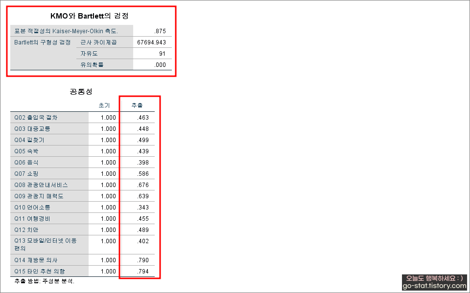 이제 나오게 될 부분, KMO와 Bartlett의 검정이 핵심적이다. 왜냐하면 요인분석에 대한 결과를 논문에 제시할 때 반드시 적어주어야 하는 부분이기 때문이다. KMO값과 Bartlett의 구형성검정에 대한 결과 값을 빼놓고 요인분석에 대한 결과표를 제시할 수 없다지 ^^. 다행히, KMO값은 0.6 이상으로 우수하며, Bartlett의 구형성 검정에 대한 결과 값도 p <0.001(넓은 관점에서 p <0.05를 충족함)로 유의한 것으로 확인되었다. 어느 정도의 KMO값이 대체 좋은 범위냐라고 묻는다면 그건 연구마다 다르다고 할 수 있다. 1에 가까울수록 높다고 보아야 하나, 0.7 이상만 되어도 무난하다.
