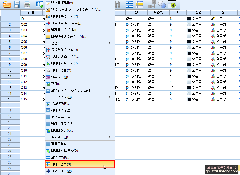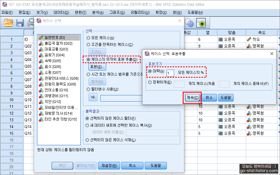그런데 문제는 자료의 표본(n)이 무척 많다는거다. 물론 이 상태로 요인분석을 해도 되지만, 1% 정도에 해당하는 표본만 무작위 추출하여 요인분석을 해보면 좋겠다는 생각이 들어서 ‘케이스 선택’ 메뉴에 들어갔다. (요인분석에 필요한 절차는 아니지만, 경우에 따라서 무작위 선택을 해서 분석할 수 있다는 것을 보여주기 위함이며, 단순 예시이니 참고만 하길 바란다)