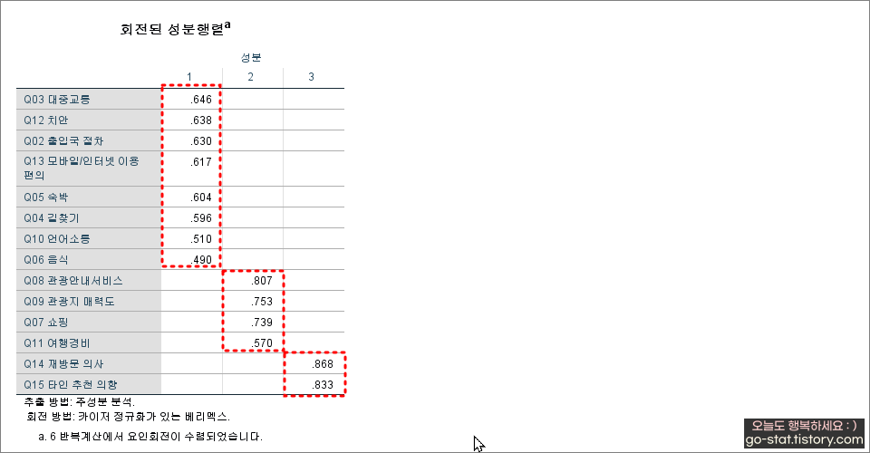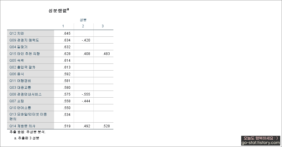 이제 연구자가 해야 할 일은 요인분석으로 나온 결과를 통해 요인명을 부여하는 일이다. 문제는 1번 요인에 많은 항목이 묶였기 때문에 어떤 이름을 지어주어야 하나 고민이 되는데.. 각 항목의 특성을 고려해서 요인명을 만들어주어야 한다. 요인명을 어떻게 지정하느냐에 따라 연구자의 센스를 엿볼 수 있다. 내가 연구자라면, 1번 요인은 ‘관광 이동 편리성’, 2번 요인은 ‘관광지 볼거리 매력성’, 3번 요인은 ‘긍정적 감정’으로 요인명을 지어줄 것이다.