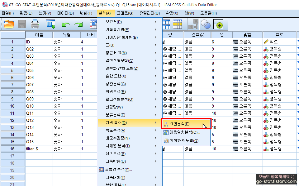 그럼 이제 요인분석을 해볼 차례~ 요인분석으로 들어가준다.