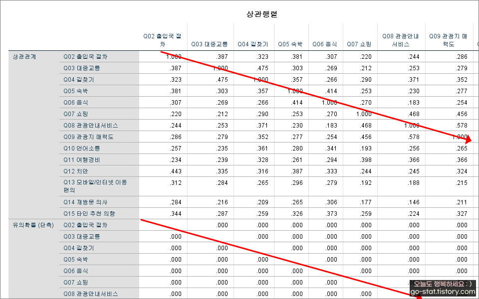다음으로는 상관행렬이 나온다. 이 부분은 연구나 논문에 크게 제시하지는 않는 부분이나, 각 변수 간의 상관관계와 유의확률(유의수준, p)을 알 수 있는 부분이다. 나는 이 부분을 논문에 제시하지 않고 참고만 한다.