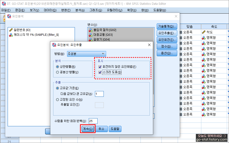 다음으로는 ‘요인추출’을 선택해줄 차례이다. 나는 기본 방법인 ‘주성분’을 선택했다. 그러나, 분석 목적에 따라... 혹은 연구 목적에 따라서 요인추출 방법은 내 연구에 필요한 방법으로 적절하게 선택해주어야 한다. 다음으로는 ‘☑스크리 도표’에 체크를 하였으나 이는 참고적인 지표이므로 반드시 체크할 필요는 없다. 여기서는 ‘방법’이 무엇인지 확인해주고 계속을 눌러준다. 특별한 이유가 없다면 고유값 기준은 기본 설정인 ‘1’로 놔두는 것이 바람직하다.