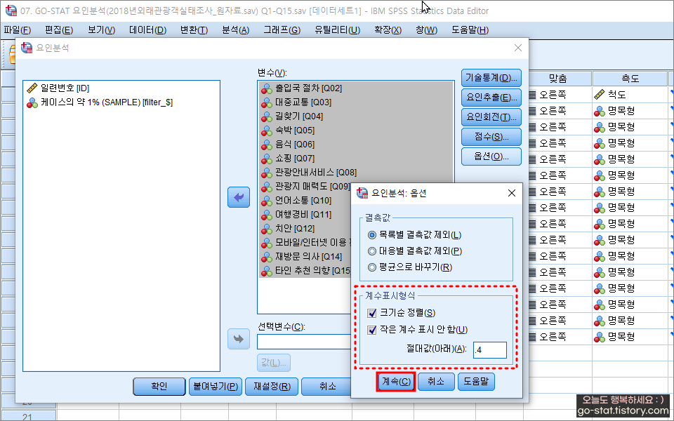 이제 거의 다 왔다. 마지막으로 ‘옵션’을 지정할 차례이다. 선택사항이나 ‘☑크기순 정렬, ☑작은 계수 표시 안 함’에 체크를 해줄 것을 권한다. 작은 계수에 대한 기준은 연구자마다 다른데, 나는 보통 0.4로 지정하는 편이다. 즉, 0.4 보다 작으면 해당 요인에 속한다고 간주하지 않겠다는 의미이다.