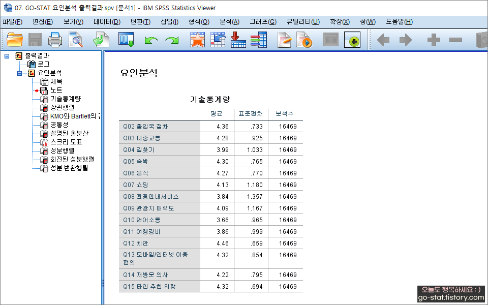 분석 결과를 확인해 보자. 가장 먼저 기술통계에 대한 분석결과가 도출된다. 여기서는 요인으로 묶이기 전의 각 변수에 대한 평균과 표준편차, 표본 수가 표시된다. 여기서 알게 된 거지만 아까 1%의 표본을 추출하겠다고 했는데, 파일을 닫고서 다시 열었더니 케이스 필터링이 되지 않은 상태에서 요인분석이 되었나 보다...ㅠㅠ 분석수(표본의 수 n=16.469) 그대로이기 때문이다. 뭐 아쉽지만 실습이니까 그대로 분석 결과를 해석해 봐야지!