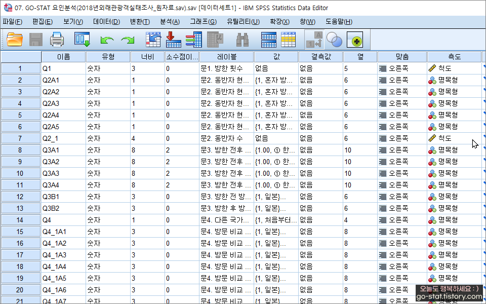 분석을 위해 어떤 데이터를 활용해 볼까..? 고민하던 중 ‘2018 외래관광객 실태조사 원자료(sav)’파일로 요인분석을 해보면 좋겠다는 생각이 들었다. 몇 년 지난 자료이지만 분석하는 데에는 이상이 없으므로 데이터 파일을 먼저 다운로드해 주자. 직접 사이트에서 다운로드하려면 아래의 링크를 클릭하면 된다.