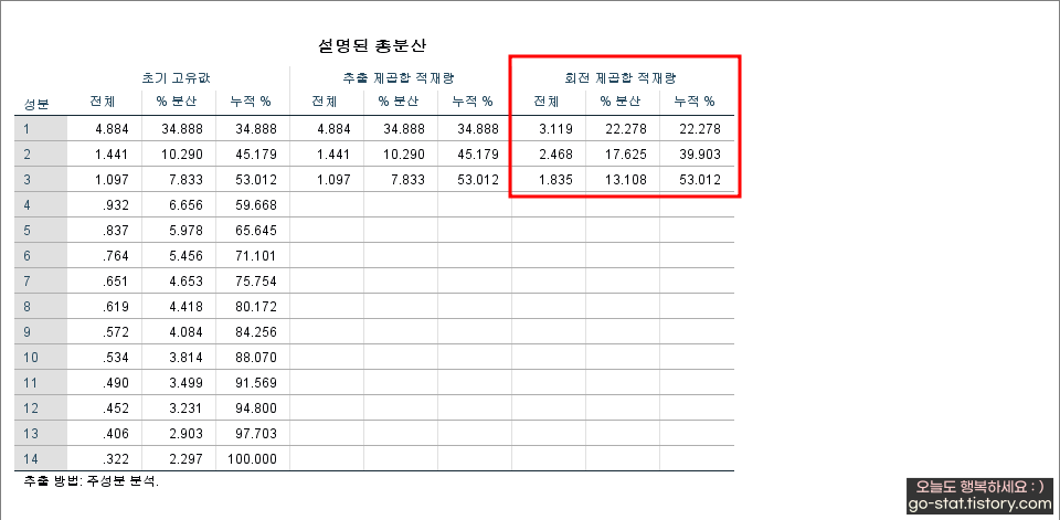 이때 연구자는 누적%(총 분산 설명력)도 함께 보아야 하는데, 아쉽지만 이 요인분석에서 총 분산설명력은 53.012%로 확인되었다. 즉, 요인분석의 결과로 이 3개의 요인이 14개의 항목을 53.012% 설명하는 것이다. 총 분산설명력(누적%)은 70% 이상이 되면 좋고, 60% 이상을 넘기는 것이 바람직하다. 아쉽지만, 이번 실습에서는 저조한 수치가 나왔다 ㅠㅠ 어떤 교수님은 총 분산설명력이 60%를 넘기지 못하면 실패한 요인분석이라고 말씀하기도 하는데.. 지금은 실습 중이니 약간 찝찝하더라도 일단 넘어가겠다. 하지만 실제 분석에서 총 분산설명력이 60%가 되지 않는다면 이대로 요인분석을 진행해도 괜찮을 것인가 신중하게 고민해보아야 한다.