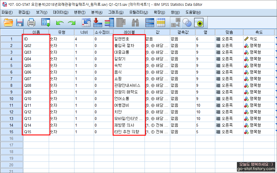 원본파일이 워낙 복잡해서 분석에 사용할 변수만 추려보았다. 아래의 사진은 분석에 활용할 변수들을 추린 모습이다. 이름을 편의상 Q02~Q15까지 바꿔주었고, 기존의 레이블도 설명이 다소 긴 듯하여 간단하게 요약해서 나타내주었다.