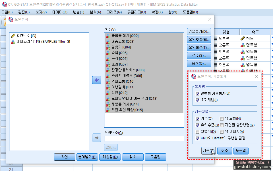 다음으로는 요인분석 결과를 확인하기 전에 몇 가지 설정을 해주어야 한다. ‘기술통계’를 눌러서 ☑일변량 기술통계, ☑계수, ☑유의 수준, ☑KMO와 Bartlett의 구형성 검정에 체크해 준다. 물론 여기에 있는 항목을 전부 다 체크해주어도 상관없다. 반드시 하나만 꼭 체크해야 한다면 ‘☑KMO와 Bartlett의 구형성 검정’이다.
