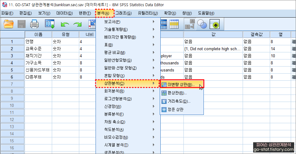 상관관계를 검증하기 위해 [분석 → 상관분석(C) → 이변량상관(B)]을 눌러준다.