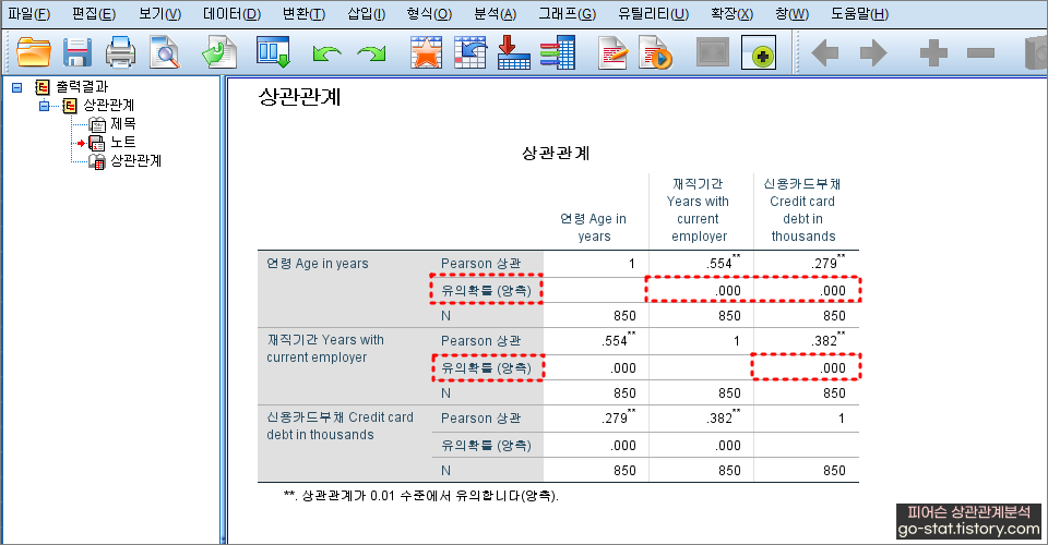 여기서 상관성을 보려는 변수들을 모두 ‘변수’ 칸에 넣어주면 된다. 나는 [연령], [재직기간], [신용카드부채] 간의 상관관계를 보고 싶어서 이 3개의 변수를 넣어주었다. 상관계수는 자동으로 ‘☑ Pearson’에 체크되어 있을 것이다. 내가 투입한 변수는 모두 연속형 척도로 구성되었기 때문에 이 부분은 따로 건드리지 않았다. 만약, 서열이나 순서척도로 구성된 변수들 간의 상관성을 보고 싶다면 ‘☑ Kendall의 타우-b’, 또는 ‘☑ Spearman’을 클릭해 주면 된다. 유의성 검정으로는 ‘양측’에 체크되어 있는데, 이 부분은 굳이 바꾸지 않았다. 이 외의 다른 옵션도 크게 건드릴 부분이 없었다.