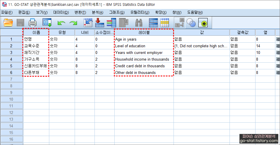 분석에 사용한 파일은 ‘bankloan.sav’이다. 파일명에서 알 수 있는 것처럼 은행대출과 관련된 자료들로 구성되어 있음을 유추할 수 있다. 원본 데이터 파일에는 변수명이 모두 영어로 되어 있었는데, 분석에 불필요한 변수들을 일부 제거하고 편의상 변수명을 한글명으로 변환해 주었다. 변수명은 ‘이름’에서, 해당 변수에 대한 설명은 ‘레이블’에서 확인할 수 있다.