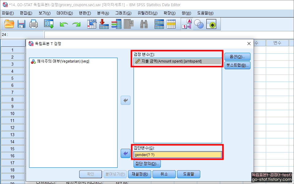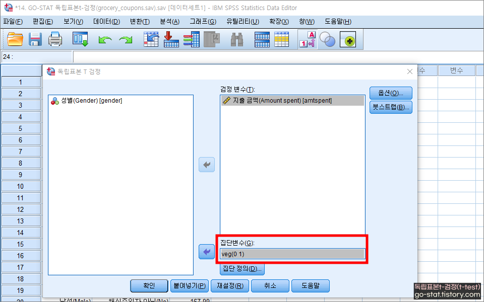 먼저 가설 1을 검증해 보자. 과연 성별[gender(남성 or 여성)]에 따라 마트에서 지출하는 금액[amtspent]에 차이가 있을까? 이 부분을 분석하려면 아래의 사진과 같이 변수를 투입해야 한다. 검정변수 칸에는 종속변수를 투입하되, 집단변수 칸에는 명목척도로 구성된(2집단 이어야 함) 독립변수를 넣어주면 된다.