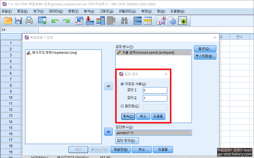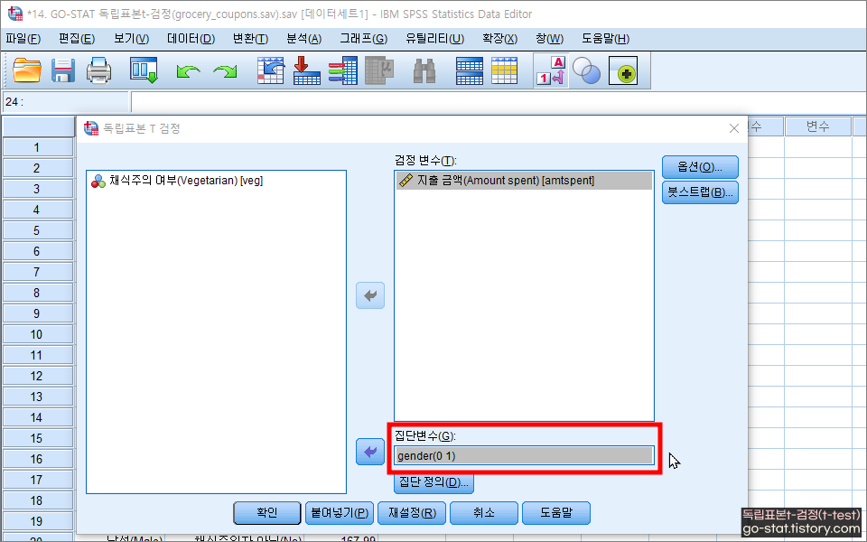 알다시피 성별은 두 개의 집단으로 구성되어 있으며, [0] 남성 [1] 여성으로 코딩되어 있다. 그러므로 집단1에 ‘0(남성)’을, 집단2에 ‘1(여성)’을 넣어준다. 무조건 0과 1만 투입하는 것이 아니라, 내가 분석하고자 하는 데이터에서 실제로 코딩된 값을 넣어주는 것이 중요하다. 가령 내가 가지고 있는 데이터에서 4로 코딩한 집단은 남성이고, 6으로 코딩한 집단이 여성을 의미한다면, 사진에서 보이는 ‘집단 1’과 ‘집단 2’ 칸에는 각각 ‘4(남성)’와 ‘6(여성)’을 넣어주어야 하는 것이다.