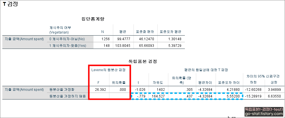 Levene의 등분산 검정 유의확률이 0.05 이상이면 윗줄에 있는 결과 값으로 해석해야 하며, Levene의 등분산 검정 유의확률이 0.05 미만이면 아랫줄에 있는 결과 값으로 분석 결과를 해석해야 한다. 이 경우, Levene의 등분산검정 유의확률이 0.499(F=0.458)로 0.05 이상이므로 윗줄에 있는 결과 값(파란색 점선으로 표시한 부분)으로 해석하였다.