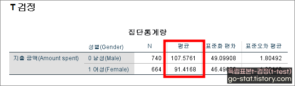 물론 눈에 보이는 평균을 비교할 때는 단순하게 기술통계분석만으로 평균 값을 확인해 어느 집단이 더 높고 낮은지 비교할 수 있지만, 독립표본 t-검정을 하는 이유는 과연 이렇게 눈에 보이는 평균의 차이가 통계적으로 유의하다고 말할 수 있는가를 검증하기 위해 하는 것이다. 즉, 남성의 지출 금액이 $107.5761로 여성의 지출금액 $91.4168보다 높은 건 누가 봐도 알 수 있는 사실이다. 하지만, 통계적 추론을 하기 위해서는 이러한 평균의 차이가 통계적으로 유의한 지 검증할 수 있어야 하는 것이다. 이러한 이유로 두 집단 간의 평균을 비교할 때 독립표본 t-검정이 활용된다.