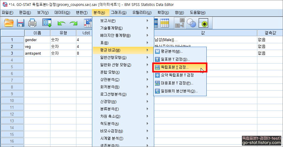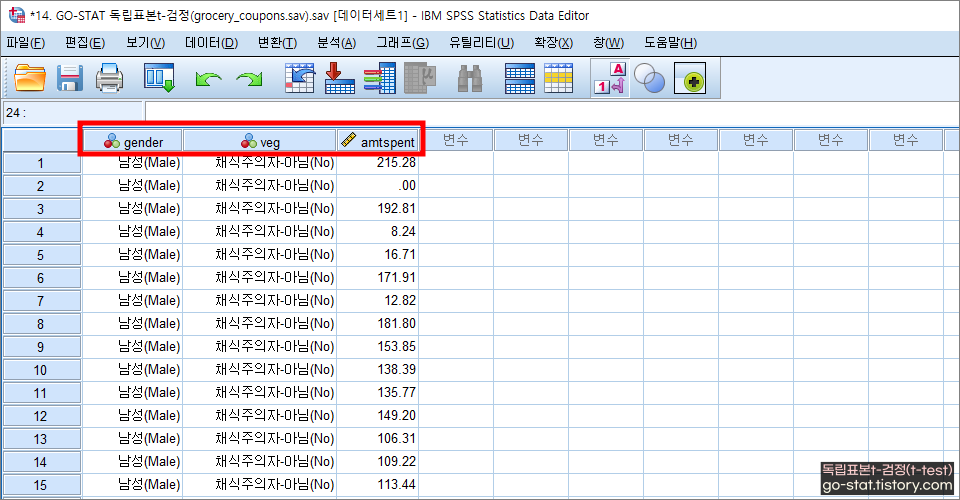 파일을 열어보면 심플하게 3개의 변수로 자료가 구성된 것을 알 수 있다. 먼저 [gender]는 성별을 가리키는 것으로 0=남성, 1=여성으로 코딩되어 있다. [veg]는 채식주의 여부를 나타내는 변수로 0=채식주의자 아님, 1=채식주의자로 이해할 수 있다. 마지막으로 [amtspent]는 amount of spent의 약자로 지출금액임을 알 수 있다. 화폐 단위는 편의상 달러($)로 칭하겠다. 여기서 [gender]과 [veg]는 각 각 두 개의 집단으로 구성된 명목척도이며, [amtspent]는 연속형 자료로 구성된 비율척도라는 것을 알 수 있다. 이 부분을 꼭 유념하고 다음으로 넘어가자.