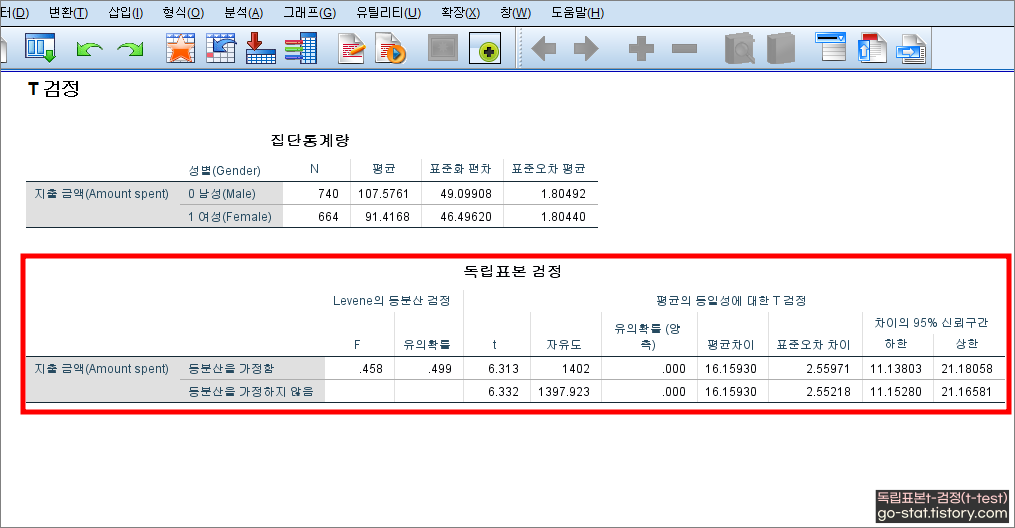 그러면 통계적으로 두 집단 간의 평균의 차이가 있는지는 어떻게 알 수 있을까? 분석 결과 창에서 ‘독립표본 검정’이라고 되어 있는 부분을 살펴보면 된다. 분석결과 창에서 두 번째로 표시되는 바로 이 부분이다.