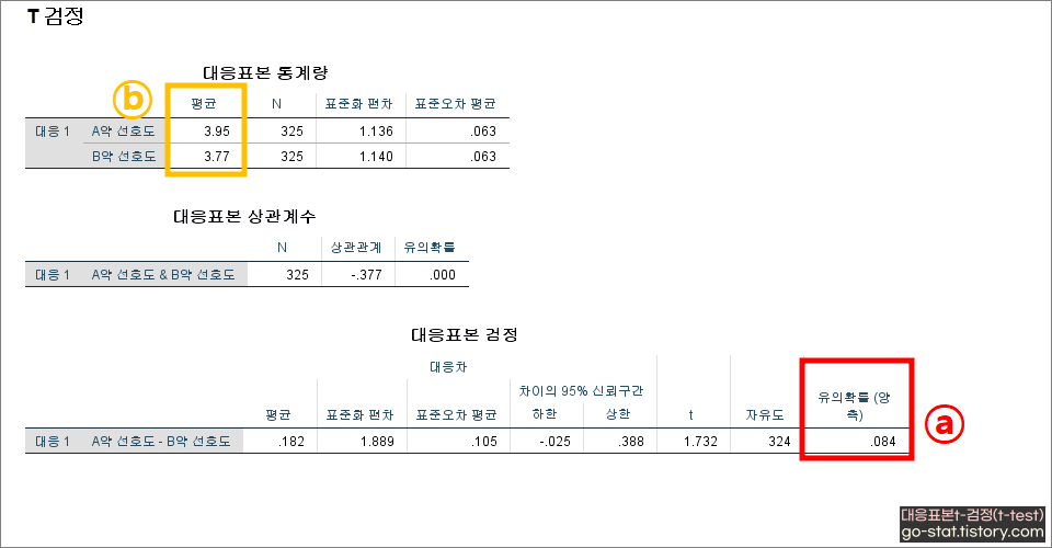 대응표본 t-검정에 대한 분석 결과이다. 가장 먼저 ⓐ 부분을 살펴보자. 결과적으로 가설1(H1)에 대한 결과는 기각된 셈이다. 왜냐하면 p값(유의확률로 표시되었지만, 실제로는 유의수준)이 0.05 이상으로 나타났기 때문이다. 사람의 눈으로 ⓑ 부분을 보았을 때 ‘A약 선호도’와 ‘B약 선호도’ 간에는 평균의 차이가 있는 것으로 보이나 이러한 평균의 차이는 통계적으로 유의하지 않은 것이다. 즉, 통계적으로 유의한 차이가 있다고 말할 수 없는 수치이다. 그러므로 가설1(H1)은 기각되었다.