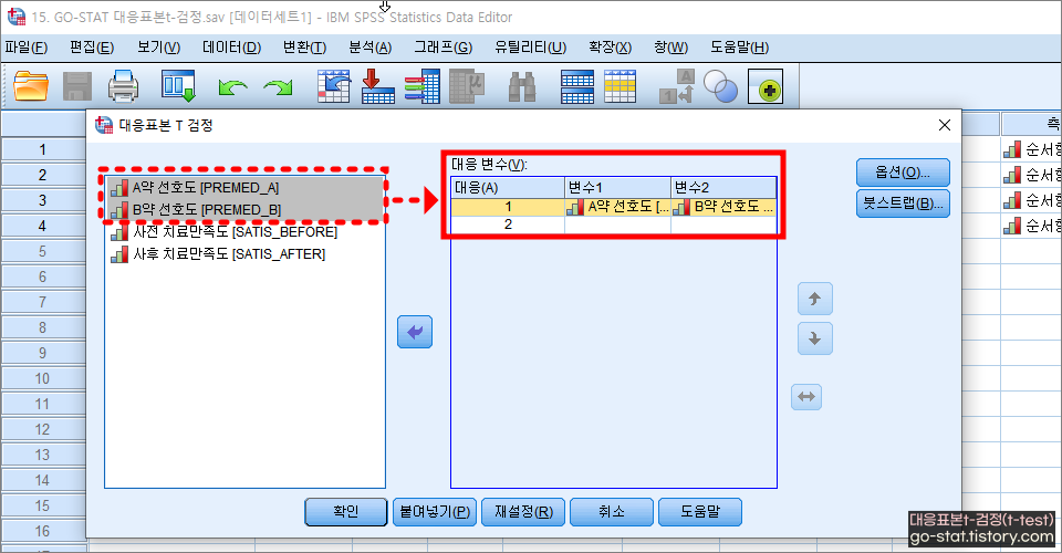 분석을 하려면 [PREMED_A]와 [PREMED_B] 변수를 동시에 선택하고 ‘대응 변수(V)’칸에 넣어준다. 여기서 옵션은 따로 건드리지 않았다. 비교하고 싶은 두 개의 변수, 즉 ‘A약 선호도’와 ‘B약 선호도’를 대응 변수 칸에 넣었다면 곧바로 확인을 눌러준다.