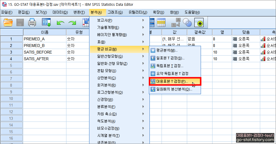 이번에는 예제 파일에서 [SATIS_BEFORE]과 [SATIS_AFTER] 변수를 활용해 ‘사전 치료만족도’와 ‘사후 치료만족도’ 간의 평균의 차이가 있는지 검증할 것이다. 그렇다면 가설은 다음과 같이 설정할 수 있겠다.