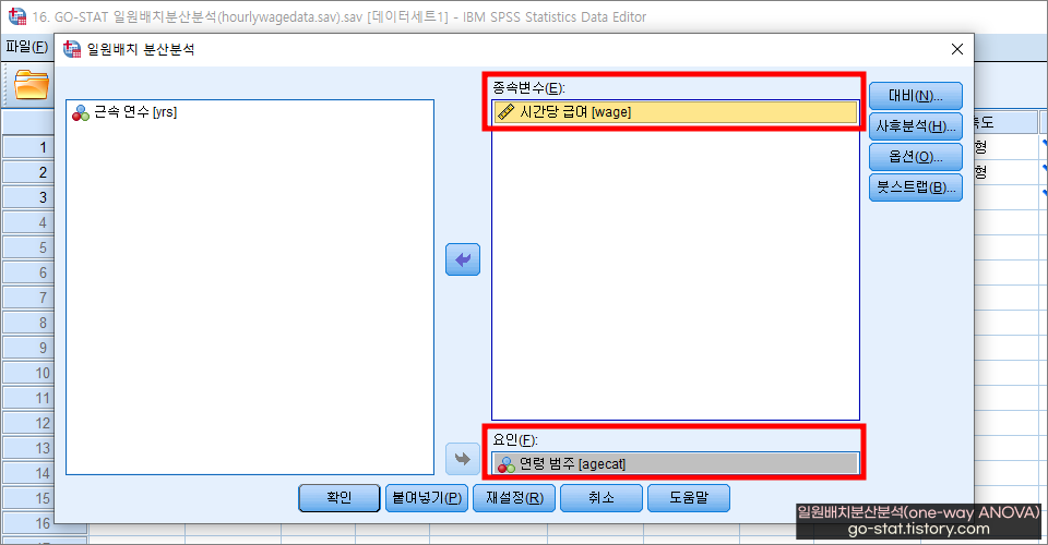 독립변수에 해당하는 ‘연령[agecat]’ 변수를 ‘요인(F)’ 칸에 넣어주고, 종속변수에 해당하는 ‘시간당 급여[wage]’를 ‘종속변수(E)’ 칸에 넣어준다. 중요한 건, ‘요인(F)’에 들어가는 변수는 3개 이상의 집단으로 구성된 범주형 자료여야 한다. 반면, ‘종속변수(E)’ 칸에는 등간 또는 비율 척도로 구성된 연속형 자료 변수를 넣어주면 된다.