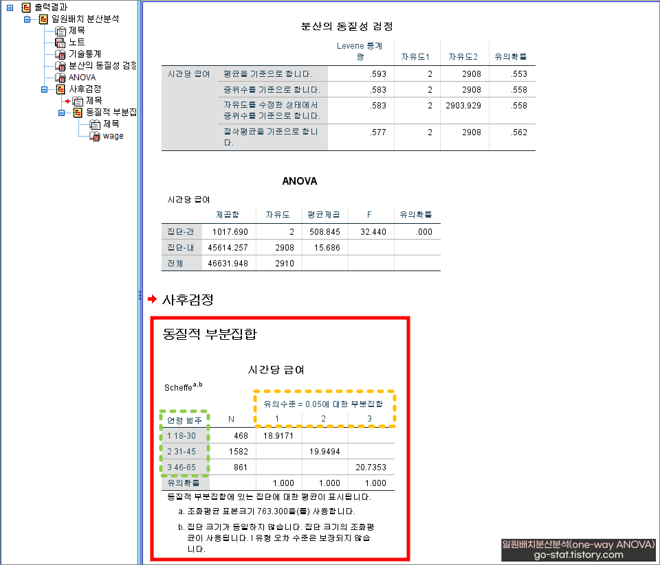 참고로 나는 등분산을 가정하고 표본(샘플)의 수가 동일하지 않은 경우에 사용할 수 있는 ‘Scheffe’ 방법을 통해 사후분석을 진행했다.